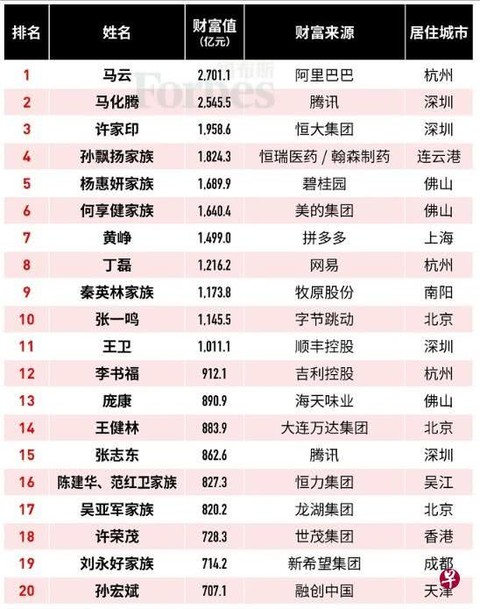 福布斯中国富豪榜:前3名意料之中,王健林财富却缩水682亿元?█〓