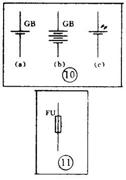 电池及熔断器符号 电池的图形符号见图 10 。长线表示正极,短线表示负极,有时为了强调可以把短线画得粗一些。图 10 ( b )是表示一个电池组。有时也可以把电池组简化地画成一个电池,但要在旁边注上电压或电池的数量。图 10 ( c )是光电池的图形符号。电池的文字符号为“ GB ”。熔断器的图形符号见图 11 ,它的文字符号是“ FU ”。