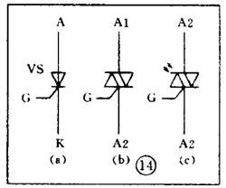晶闸管、单结晶体管、场效应管的符号 晶闸管是晶体闸流管或可控硅整流器的简称,常用的有单向晶闸管、双向晶闸管和光控晶闸管,它们的符号分别为图 14 中的( a )( b )( c )。晶闸管的文字符号是“ VS ”。