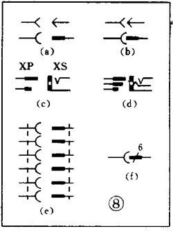 ( 2 )接插件的符号 接插件的图形符号见图 8 。其中( a )表示一个插头和一个插座,(有两种表示方式)左边表示插座,右边表示插头。( b )表示一个已经插入插座的插头。( c )表示一个 2 极插头座,也称为 2 芯插头座。( d )表示一个 3 极插头座,也就是常用的 3 芯立体声耳机插头座。( e )表示一个 6 极插头座。为了简化也可以用图( f )表示,在符号上方标上数字 6 ,表示是 6 极。接插件的文字符号是 X 。为了区分,可以用“ XP ”表示插头,用“ XS ”表示插座。