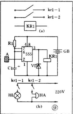 继电器的符号 因为继电器是由线圈和触点组两部分组成的,所以继电器在电路图中的图形符号也包括两部分:一个长方框表示线圈;一组触点符号表示触点组合。当触点不多电路比较简单时,往往把触点组直接画在线圈框的一侧,这种画法叫集中表示法,如图 9 ( a )。当触点较多而且每对触点所控制的电路又各不相同时,为了方便,常常采用分散表示法。就是把线圈画在控制电路中,把触点按各自的工作对象分别画在各个受控电路里。这种画法对简化和分析电路有利。但这种画法必须在每对触点旁注上继电器的编号和该触点的编号,并且规定所有的触点都应该按继电器不通电的原始状态画出。图 9 ( b )是一个触摸开关。当人手触摸到金属片 A 时, 555 时基电路输出( 3 端)高电位,使继电器 KR1 通电,触点闭合使灯点亮使电铃发声。 555 时基电路是控制部分,使用的是 6 伏低压电。电灯和电铃是受控部分,使用的是 220 伏市电。