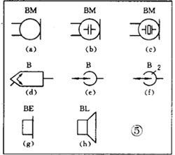 扬声器、耳机的符号 扬声器、耳机都是把电信号转换成声音的换能元件。耳机的符号见图 5 ( g )。它的文字符号是“ B E ”。扬声器的符号见图 5 ( h ),它的文字符号是“ BL ”。